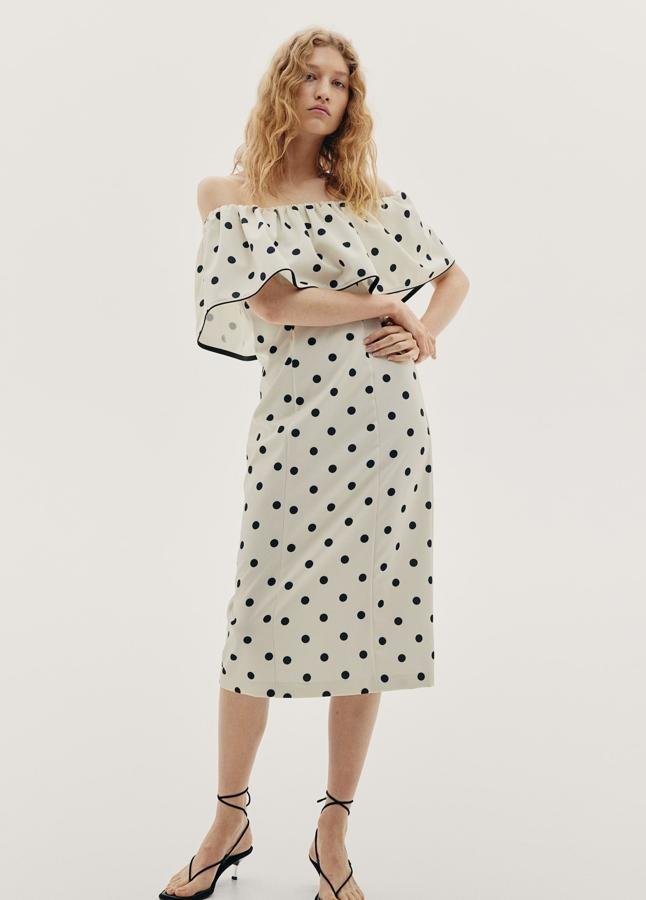 Vestido midi entallado con ligero brillo y escote con hombros al descubierto, volante ancho en el escote con ribete decorativo y costuras moldeadoras en delantero y espalda. Precio: 49,99 euros.
