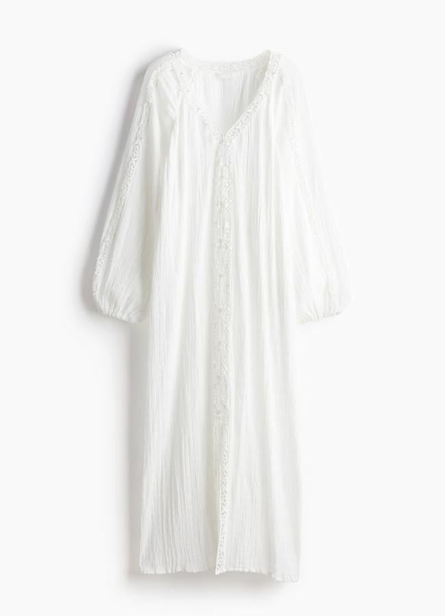 Vestido midi de algodón con efecto arrugado. Un diseño de corte holgado con ribetes e inserciones de encaje, escote de pico y mangas globo largas de corte raglán. Precio: 39,99 euros.