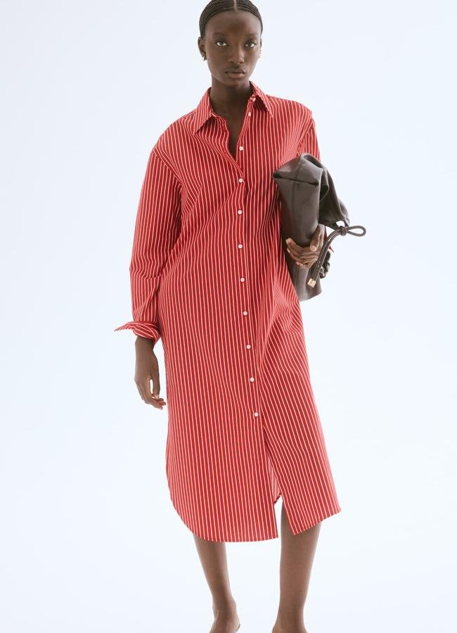Vestido camisero midi en popelina fresca de algodón con botones delante. Un modelo de corte holgado con cuello, hombros caídos y mangas largas con perilla y puños abotonados. Precio: 29,99 euros.