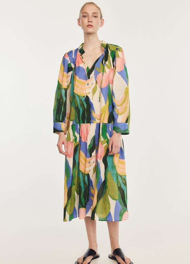 Vestido midi de algodón con cuello de volante con lazada fina y abertura en V. Destaca por sus mangas globo con puños anchos y la costura fruncida bajo la cadera para añadir un toque de volumen. Precio: 32,99 euros.