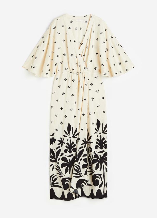 Vestido midi en tejido vaporoso de mezcla de viscosa con un diseño con escote de pico cruzado, mangas mariposa al codo, costura fruncida en la cintura y bajo recto. Precio: 59,99 euros.