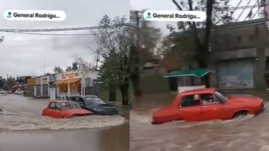 Un poquito de humor ante tanta dificultad por la lluvia interminable y las inundaciones. El video muestra a un Renault 12 rojo avanzando por una calle de General Rodríguez, según identifica la ubicación.
