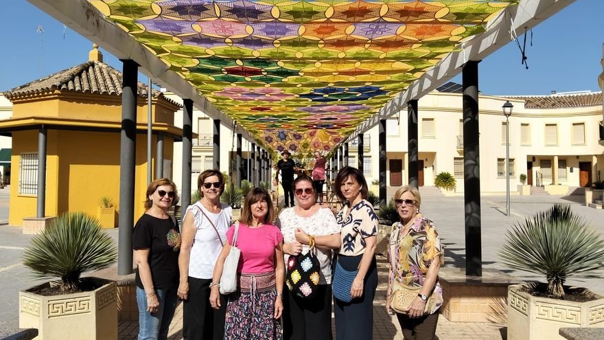 En la plaza Melchor Continente de Palma del Río se ha colocado un toldo para ofrecer un refugio climático de sombra en esta soleada plaza. Este toldo no es un elemento cualquiera porque ha sido realizado por la asociación Palma Croché, un grupo de mujeres que se reúne dos días a la semana en la sede del Ateneo Científico y Artístico de la ciudad para «tejer con hilo y aguja, hablar un ratito, reírnos y tomarnos un cafelito«, relata Nieves García, presidenta de la asociación.