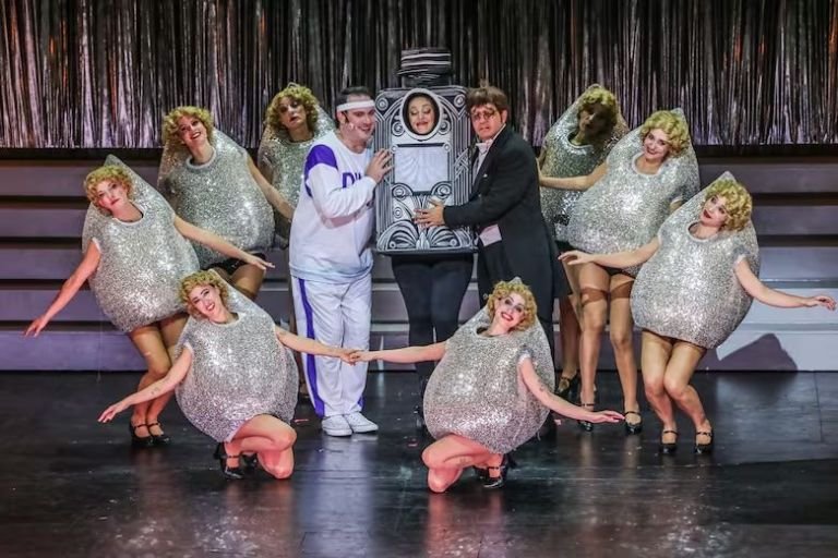 En paralelo, el trabajo actoral amplifica la dimensión crítica del espectáculo. Iride Mockert encarna una galería de personajes femeninos —La Argentina, Vaselina, la cocainómana— que operan como condensaciones de estereotipos construidos y reproducidos por la revista, pero también como intervenciones que los ponen en tensión desde el presente. A su alrededor, Javier Marra, Fabián Minelli, Fran Andrade, Jerónimo Giocondo Bosia, Romina Groppo, Jessica Abouchain y María Rojí despliegan una versatilidad que va del grotesco al lirismo, transitan múltiples registros y cuerpos, y multiplican voces y acentos sin perder organicidad. No hay jerarquías entre lo alto y lo bajo: el elenco funciona como un cuerpo escénico colectivo que interroga las formas de representación.