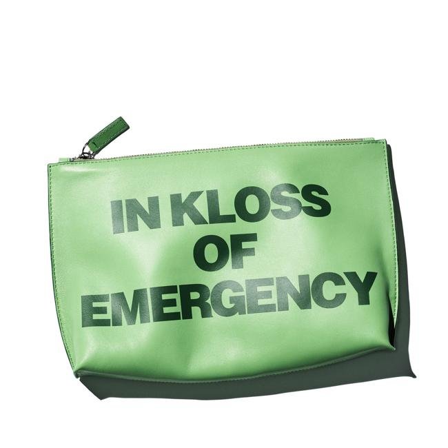 Una de las modelos con mayor perspicacia en esta colección ha sido Karlie Kloss, que ha reinventado en un neceser la frase ‘en caso de emergencia’, a través de un juego de palabras con su apellido. Seguro que en ese neceser puedes llevar todo lo necesario en caso de emergencia.
