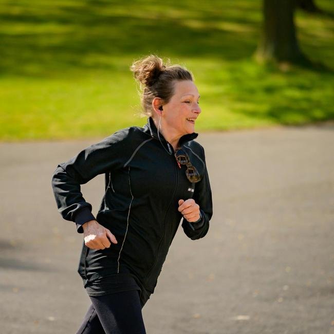 Mujer corriendo por un parque.