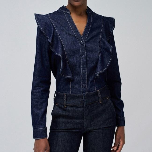 Por último, para quienes buscan una pieza más estructurada y sofisticada, Salsa Jeans propone una camisa de corte regular y escote en pico, adornada con un volante grande en la parte delantera que estiliza la figura. Está confeccionada en light denim, un tejido ligero y cómodo ideal para el día a día.