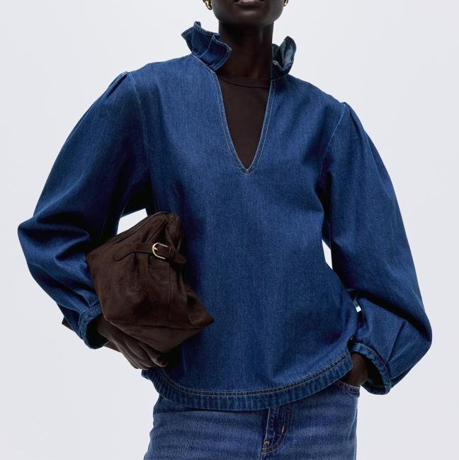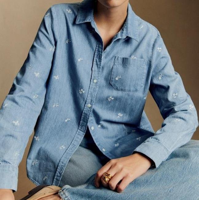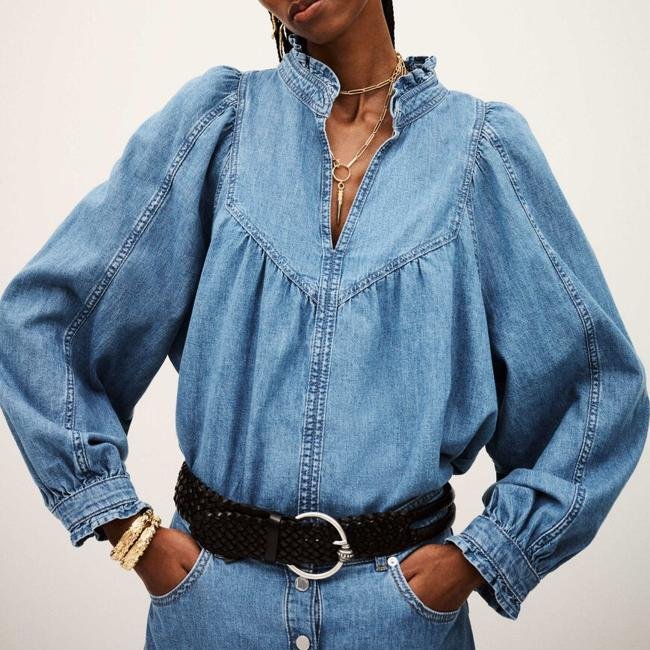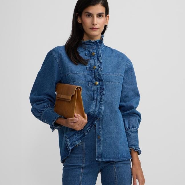Si prefieres algo más clásico, en Sézane, una de nuestras firmas francesas favoritas, tienes la camisa vaquera tradicional: cuello con solapas, cierre de botones y un diseño atemporal que nunca falla.