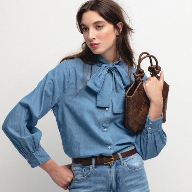 Si eres fan de los diseños románticos y sofisticados, una camisa vaquera con lazada es una gran elección. Este modelo de Hug&Clau tiene cierre de botones frontal, mangas abullonadas y un lazo en el cuello que puedes adaptar a tu gusto: suelto, en forma de nudo o hacia atrás, según el toque que quieras darle a tu look.