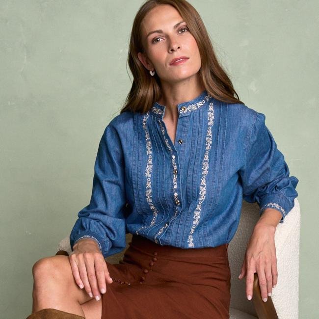 Para ir un paso más allá, nos encanta la propuesta de Polín et Moi. Su blusa denim con bordado floral vertical y jaretas decorativas aporta un aire artesanal y femenino. De manga larga con fruncidos en los puños y cuello redondo, es una prenda con mucho encanto.
