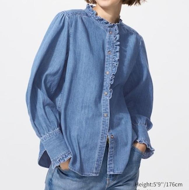 En esa misma línea encontramos este modelo de Uniqlo, confeccionado en 100% algodón ligero. Destaca por su pequeño volante que recorre el cuello redondo y la tapeta de botones, un detalle sutil y romántico que eleva cualquier look.