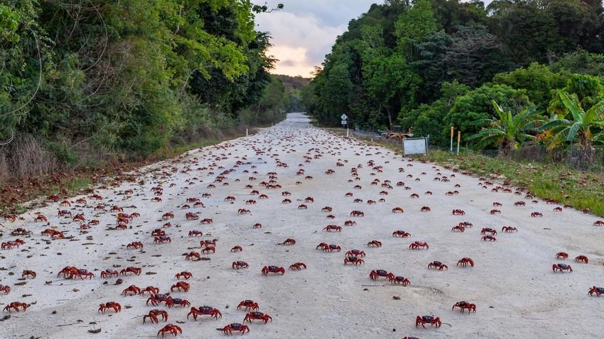 Como todos los años por estas fechas, la pequeña isla de Navidad, en Australia, queda literalmente invadida por cangrejos rojos (Gecarcoidea natalis), millones de los cuales emprenden su migración anual para ir desde sus refugios en los bosques del interior hacia el mar.
