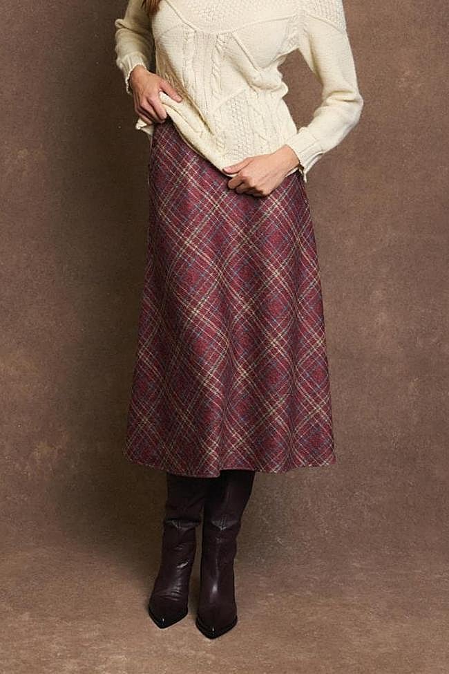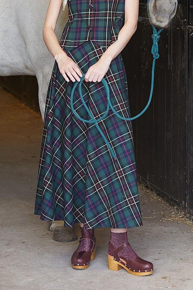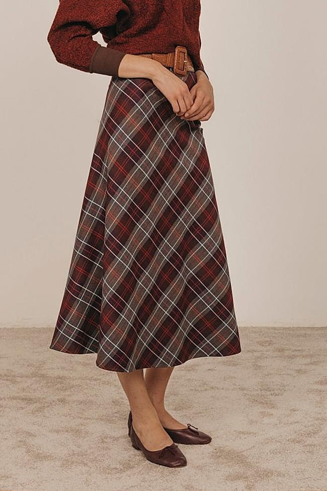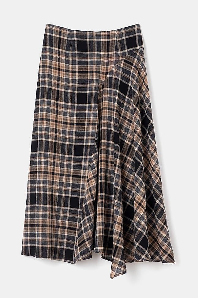 Falda confeccionada en un elegante tejido de cuadros Manteco. Presenta un diseño de tiro medio y largo midi con corte evasé y un favorecedor acabado asimétrico. Cuenta con cremallera en el centro de la espalda y ha sido diseñada y confeccionada íntegramente en España. Precio: 130 euros.