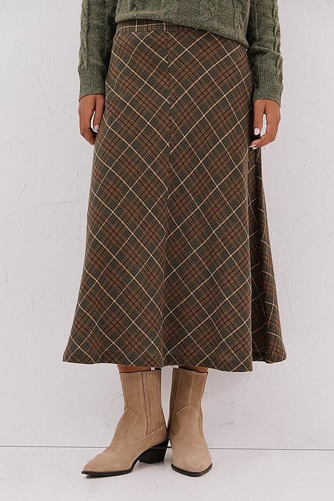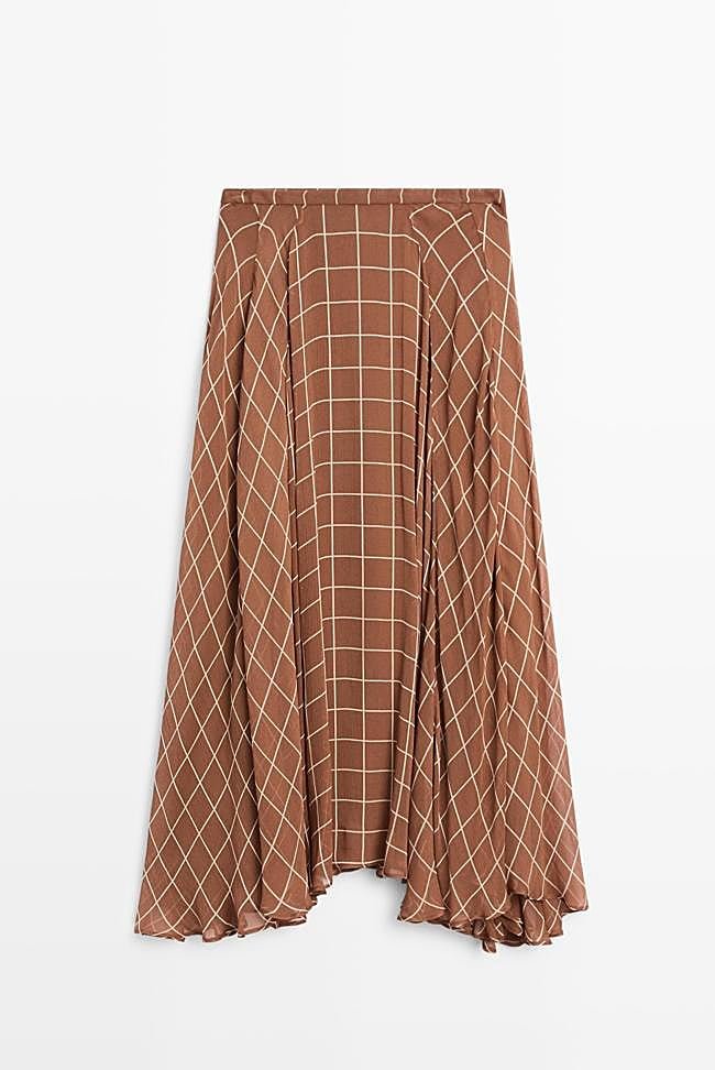 Si prefieres algo más fluido, prueba con esta falda larga en un favorecedor color marrón. Tiene un cierre mediante cremallera en la parte posterior, forro interior y el detalle de costuras. Su estampado de cuadros blanco es de los más originales del mercado. Precio: 89,95 euros.