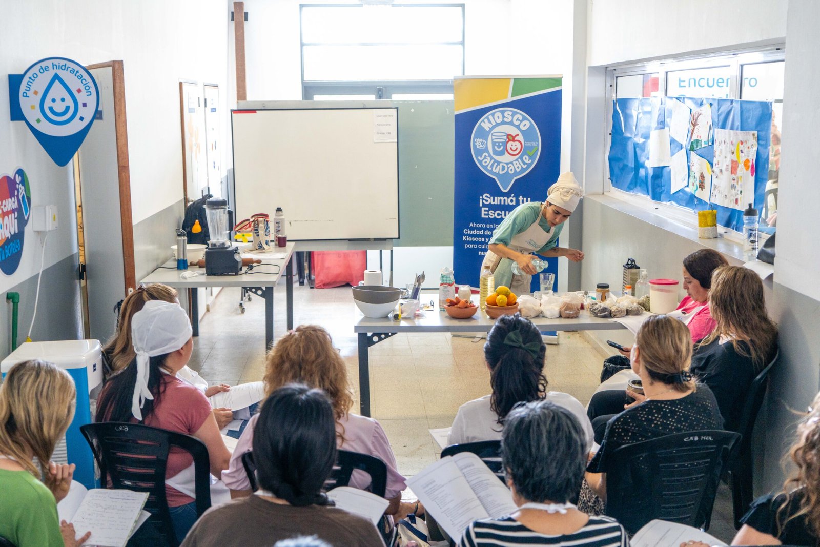 La jornada incluyó la puesta en práctica de recetas de panes integrales, galletas, budines basados en frutas y semillas y bebidas naturales sin azúcar. Contar con estas opciones en las cantinas fortalece la oferta de los kioscos para que en cada recreo la elección saludable sea la más fácil.