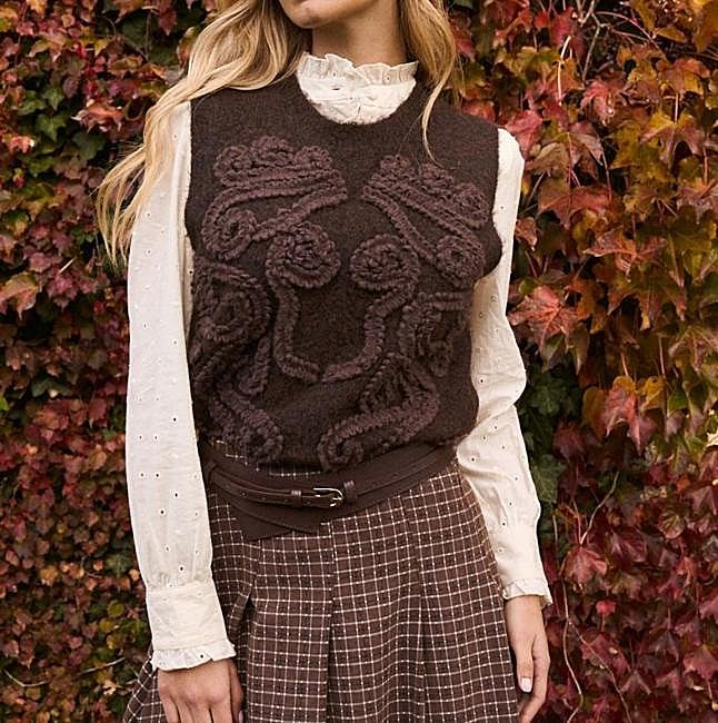 Ficha este chaleco de punto en color marrón, con escote redondo y un delicado diseño de bordados a tono en la parte delantera que aporta textura y personalidad a la prenda. Precio: 49,95 euros.
