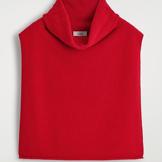 Diseñado en un color rojo saturado, está confeccionado en lana con toques de cashmere para una sensación lujosamente suave y cuenta con un cuello alto que cae con elegancia alrededor del cuello. Precio: 99 euros.