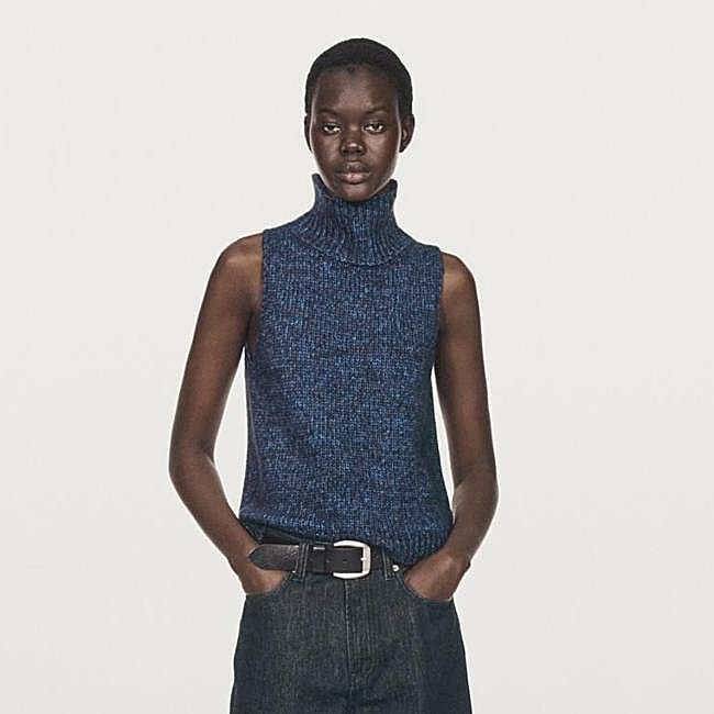 Este es un chaleco de punto con lana, con cuello alto y acabados en rib que destaca por tener un tejido con acabado metalizado ideal para las fiestas navideñas. Precio: 59,95 euros.