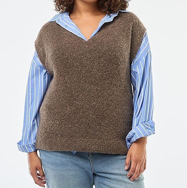 Este es un jersey sin mangas, de punto fino y cuello en V. Tiene un color marrón que combina con todo y es perfecto para llevar ahora pero también en entretiempo. Precio: 20 euros.