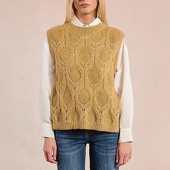 Este es un jersey de manga sisa, cuello redondo y corte recto. Un modelo en punto calado, con transparencias y el detalle de lazo en los laterales en un favorecedor color mostaza. Precio: 52 euros.