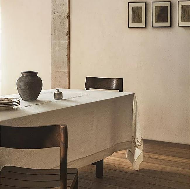 Otro modelo que también podría estar hecho por tu abuela y conservado como parte del ajuar familiar es un diseño de lino 100% en tono natural con bordado floral, detalles perforados y vainica en el contorno. Elegante, delicado y con un toque muy naive, está disponible para 6-8 comensales y también en tamaño 8-10 con un precio de entre 159 y 179 euros.
