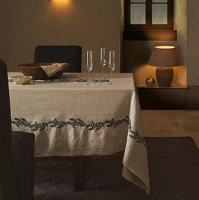 Por último, nos quedamos con uno de esos manteles que se ponía en la casa familiar en las celebraciones: un mantel de dos metros y medio en lino natural con bordado de hojas verdes en contraste distribuidas a lo largo de los bordes y una franja central decorativa. ¿Su precio? 129 euros.