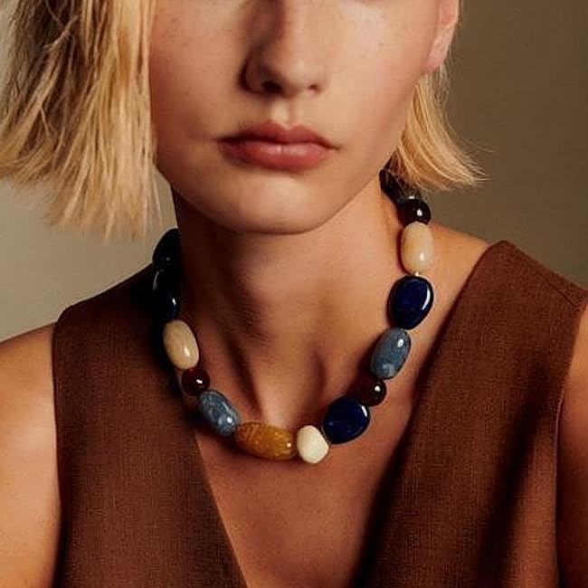 Collar XL con un diseño de bolas desiguales en diferentes colores, estampados y acabados. Tiene un cierre ajustable y una combinación de colores perfecta para la temporada de otoño e invierno. Precio: 35,99 euros.