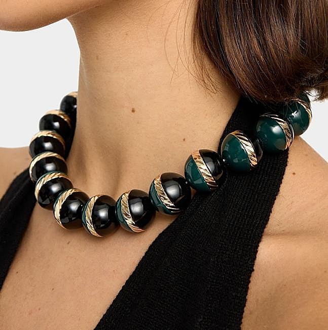 Collar corto con cuentas bicolor de resina. Tiene detalles metálicos, cierre de mosquetón y un acabado que combina el verde y el negro con el dorado. Precio: 15,99 euros.