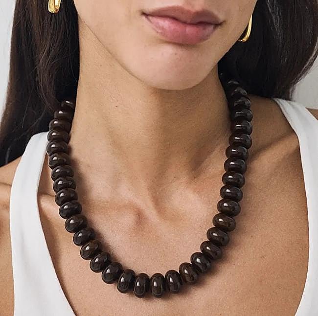 Gargantilla de bolas de resina en chocolate, el color tendencia de la temporada. Tiene un cierre de cadena y mosquetón. Precio: 25,90 euros.