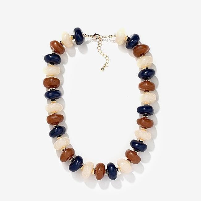 Collar maxi con cuentas acrílicas tricolor. Tiene una combinación de tonalidades perfecta para llevar con pantalones vaqueros. Precio: rebajado a 10,49 euros.