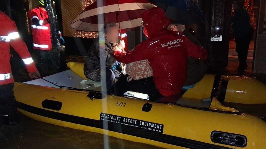Agentes de la Policía Local de l’Alcúdia evacúan a una mujer con movilidad reducida de su vivienda, ante el riesgo de inundación. / Fernando Bustamante