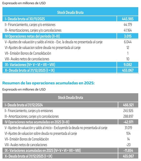 A lo largo de 2025, el stock de deuda bruta mostró una reducción acumulada de U$S 11.854 millones, al pasar de U$S 466.921 millones en diciembre de 2024 a USD 455.067 millones al cierre de 2025, según el detalle de operaciones acumuladas del año.