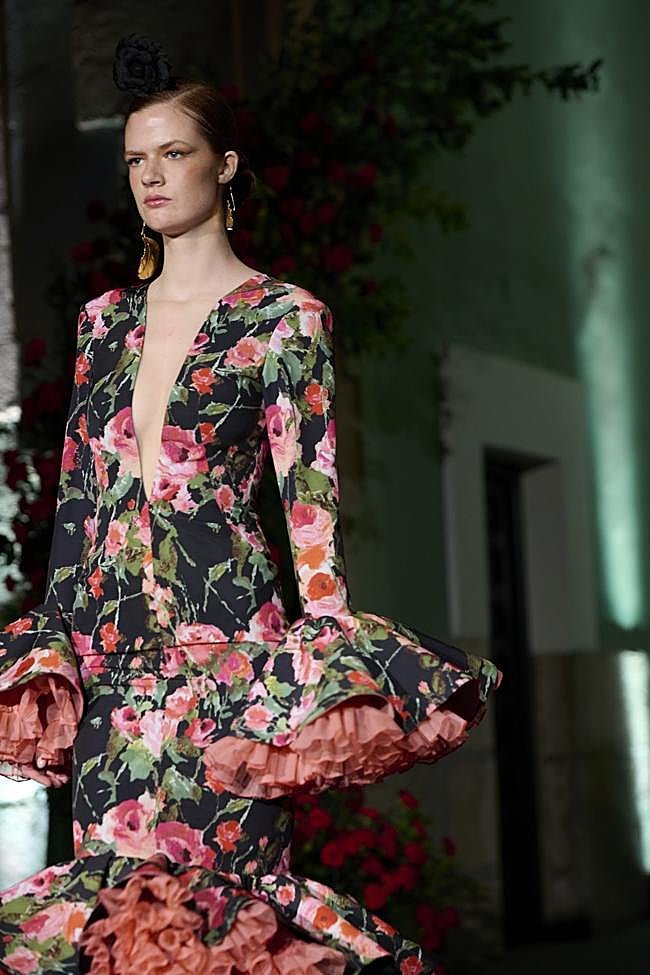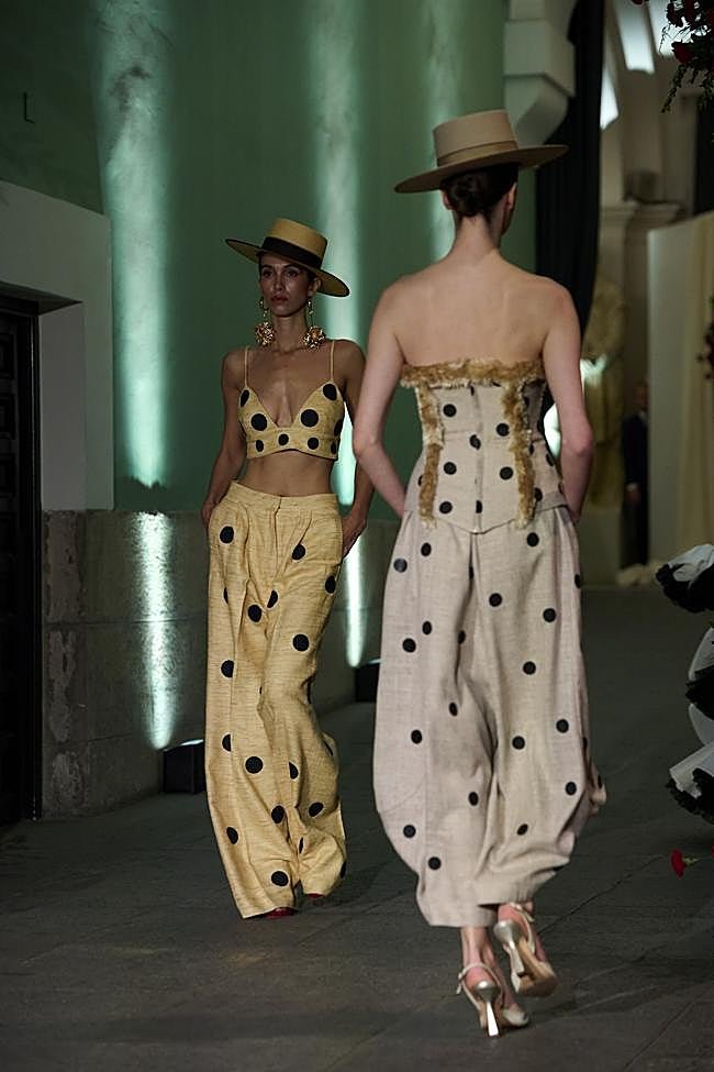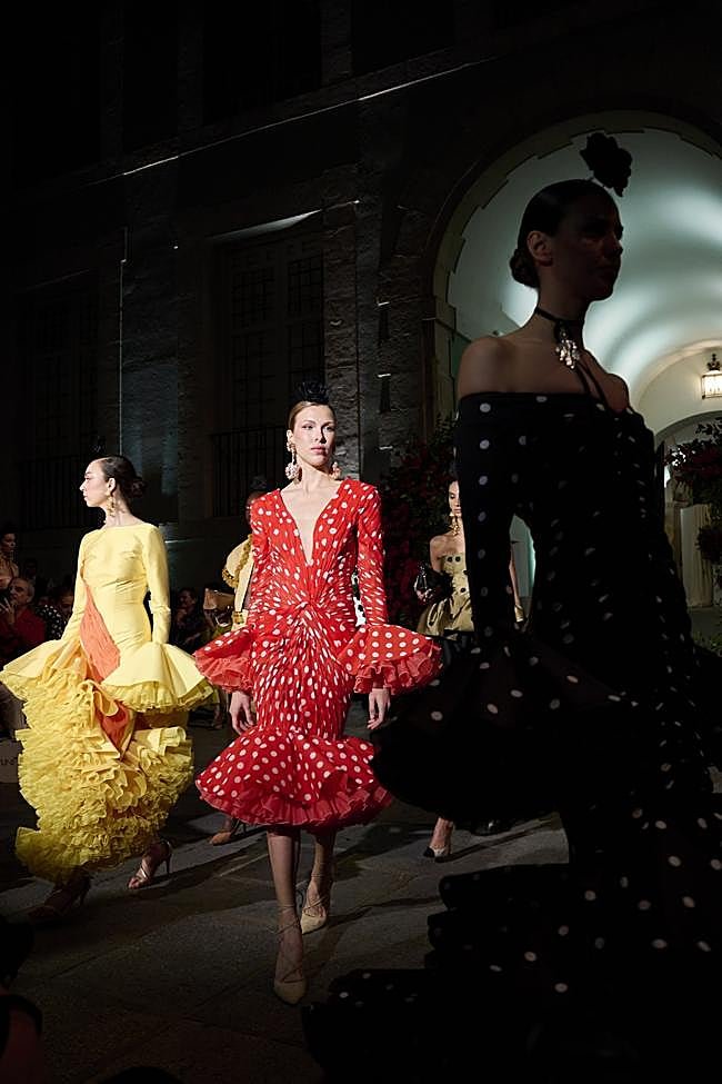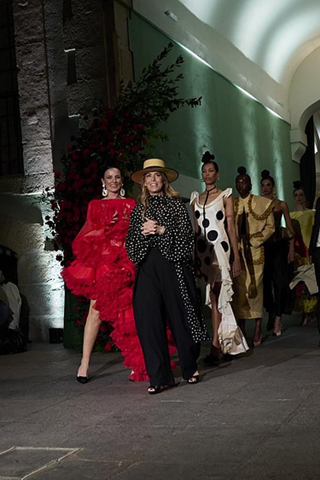 La diseñadora recuerda con emoción sus primeros desfiles en Madrid, aquellos años en los que comenzaba a consolidarse como escaparate del talento nacional. «Han pasado casi diez años desde aquellos primeros momentos», comenta, mientras le recuerdo cómo se me quedó grabado en la memoria aquel vestido de gasa negra bordada del desfile de 2016, o cómo puso en pie a un pabellón entero cuando sacó sobre la pasarela a Medina Azahara en 2017. «Ha llovido mucho desde entonces», le recuerdo, y reconoce que «yo mantengo la moda flamenca por y para mis clientas, si lo dejara, pues perdería mi esencia, mis principios. Siempre habrá ese hilo rojo que dice la gente y que me une a mi tradición, a mi cultura, a mi Andalucía«. Porque para ella, cada presentación es más que un simple ejercicio estético: es un episodio dentro de una historia mayor, una narrativa que conecta el pasado personal con el devenir de su firma.