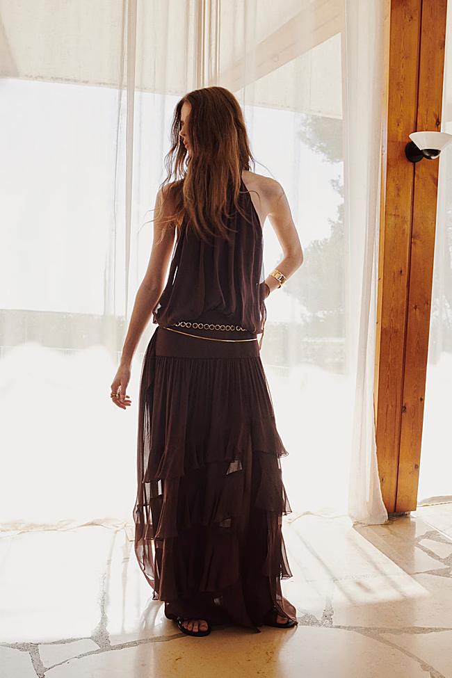 Si te gusta el estilo boho y prefieres siluetas más relajadas, no puedes dejar escapar este vestido en color marrón chocolate. Tiene diseño de volantes, escote halter, espalda descubierta y un pañuelo extraíble. Con corte a la cintura, es ideal para combinar con botas cowboy o sandalias planas. Cuesta 119,99 euros.