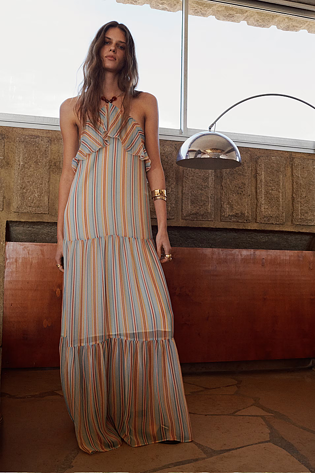 Para quienes prefieren colores más vivos, este vestido de rayas en tonos azul y naranja es una opción perfecta. También de estilo boho, cuenta con escote halter, volante en el cuello y detalle de abalorios que lo hacen especialmente llamativo. Cuesta 59,99 euros.