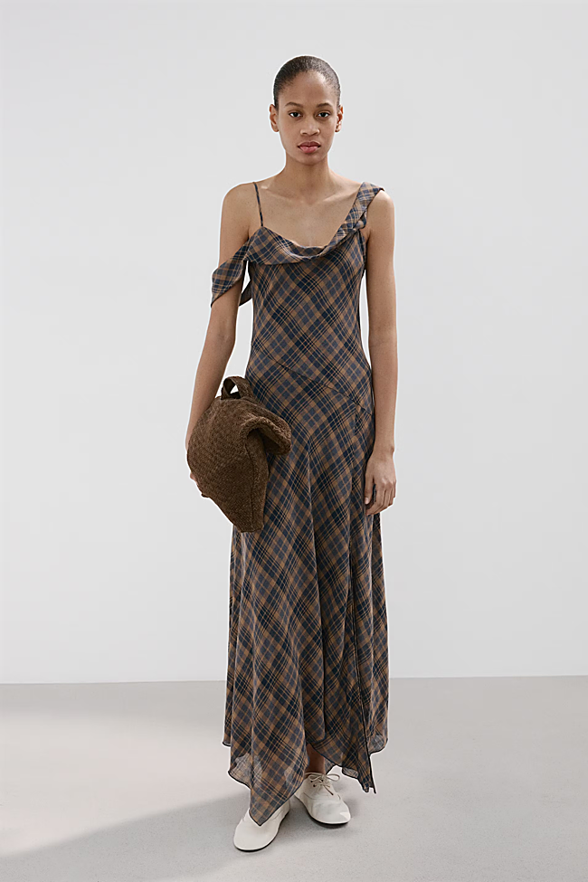 Por último, una opción más casual: un vestido de cuadros que, aunque pueda parecer otoñal a primera vista, destaca por su escote asimétrico y falda fluida, también asimétrica, que lo hacen perfecto para la primavera. Cuesta 49,99 euros y puedes combinarlo incluso con zapatillas oscuras para un look cómodo y actual.