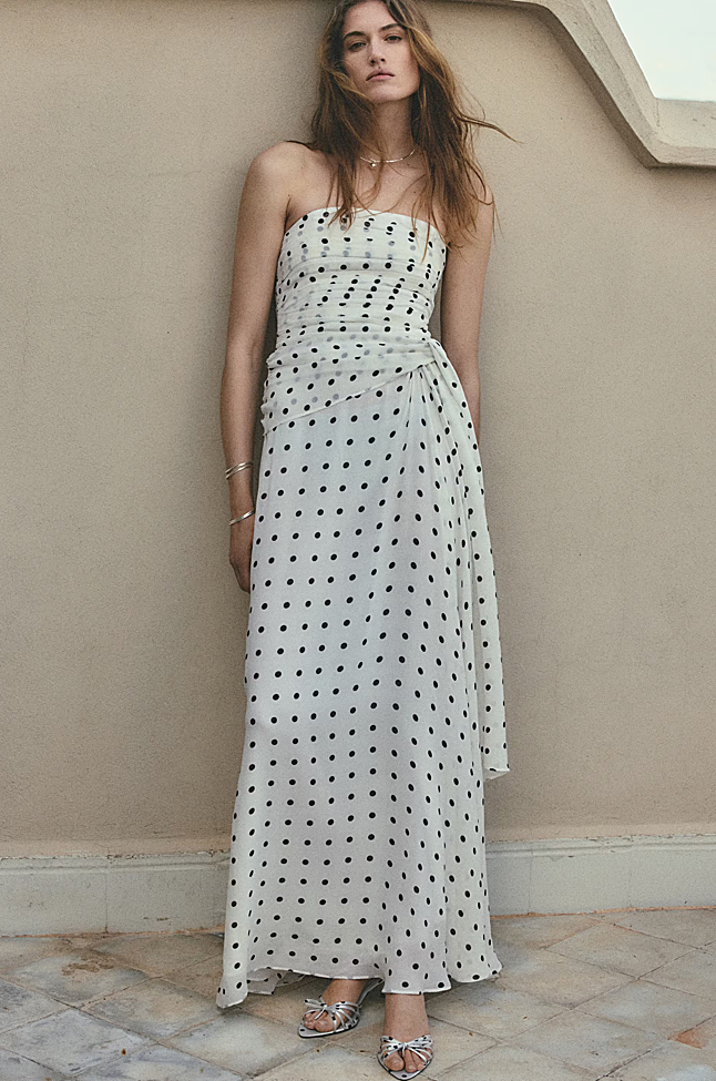 El primero es un vestido que puedes llevar tanto en ocasiones especiales como en planes más informales. Confirma la tendencia de los lunares, con escote palabra de honor, falda ligeramente evasé y un drapeado en el cuerpo que termina en un nudo lateral en la cintura. Cuesta 89,99 euros.