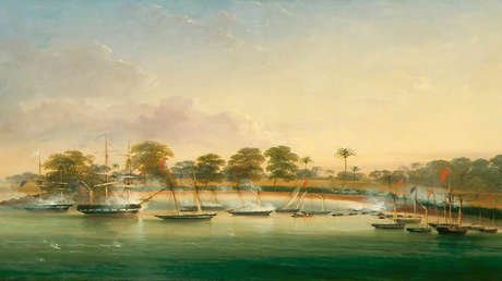 ‘Buques de guerra británicos atacados por el rey de Lagos’, de James George Philp, representa el ataque naval que en 1851 derrocó al rey local Kosoko y lo sustituyó por un aliado británico, Akitoye. Ese episodio es considerado el primer paso en la conquista británica de Nigeria, que culminó en 1861.