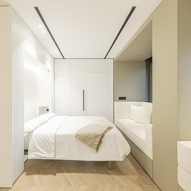 Precisamente esa capacidad de transformación de la vivienda es su gran atractivo, ya que además del tabique móvil, también dispone de mobiliario abatible (desde la cama a la mesa de comedor) y elementos extraíbles (los armarios) que permiten que la vivienda puede adaptarse a distintos usos a lo largo del día.