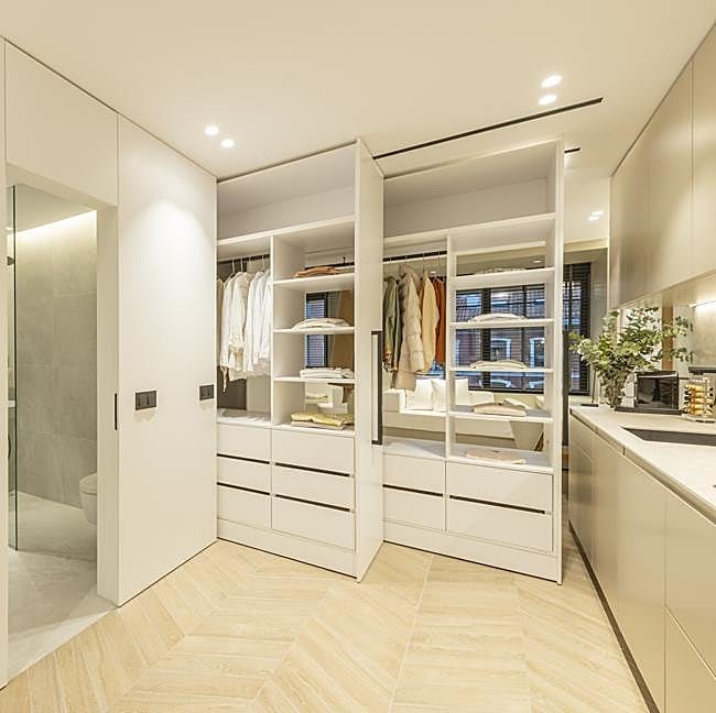 Desde DmasC Arquitectos detallan que «el espacio permite configuraciones como salón, comedor, zona de trabajo, vestidor o dormitorio sin necesidad de modificar la estructura, simplemente mediante la activación de los distintos elementos integrados, como los propios armarios, los cuales están motorizados y salen y se recogen solos«.