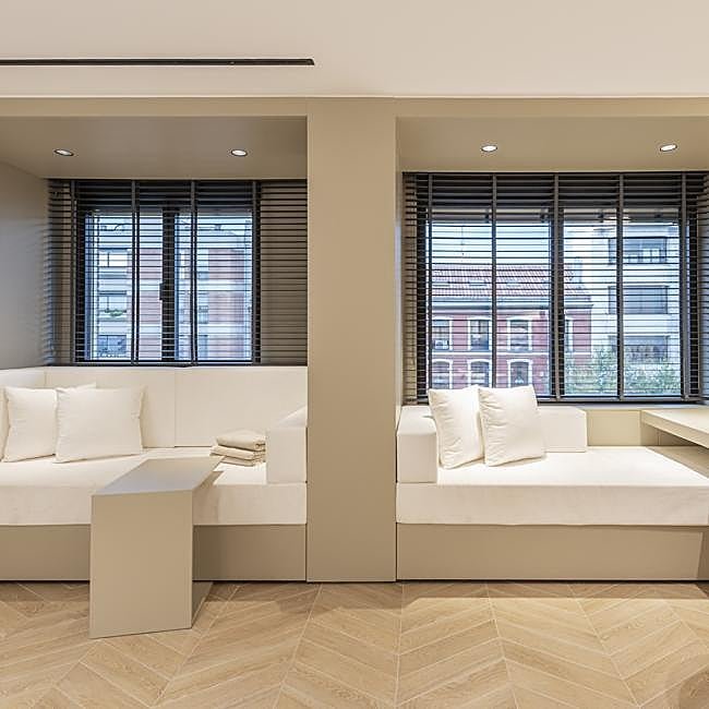 Por último, además del mobiliario a medida y la creación de un espacio 100% convertible, el color y la luz juegan un papel fundamental a la hora de generar sensación de amplitud. Por un lado, se potencia la iluminación natural a través de dos grandes ventanales que presiden el espacio. Por el otro, la paleta utilizada, engamada en grises claros y tonos beige, aporta calidez al espacio y lo amplía visualmente.