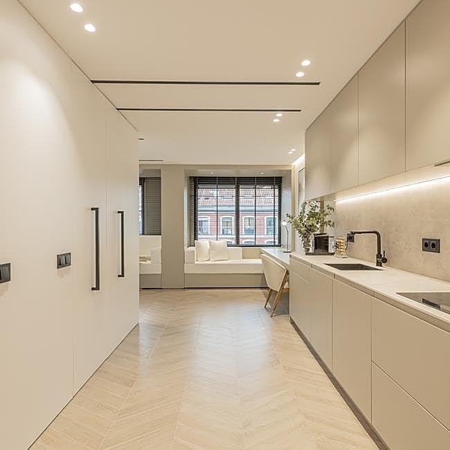 Además, al eliminarse marcos y molduras y apostar por un panelado unificado de todas las superficies, tanto en las zonas de almacenaje extraíble como en la propia cocina integrada, se genera homogeneidad y sensación de continuidad, lo que también ayuda a que la estancia parezca mucho más grande.