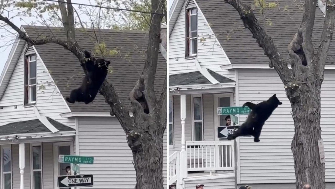 NEW: Black bear finally falls from a tree after being tranquilized in an Albany, New York neighborhood. A crew was seen setting up netting and padding to prevent the bear from getting injured after being tranquilized. The bear was seen gripping the trunk before falling as the… pic.twitter.com/p9AdBRBjId