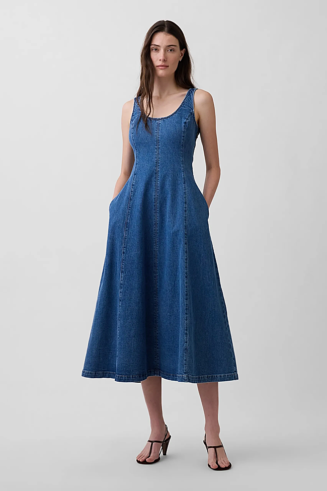 Si te gusta más el largo midi, este vestido midi en denim de algodón con cuerpo entallado y falda con vuelo es ideal. Es un modelo con escote bailarina, tirantes finos y cremallera oculta en la espalda. Precio: 39,99 euros.