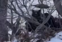 Con permiso: mamá osa y sus crías se comen el alimento obtenido por un...