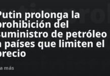 El presidente de Rusia, Vladímir Putin, prolongó este lunes la prohibición del suministro de petróleo y sus derivados a los países que apliquen el tope a...